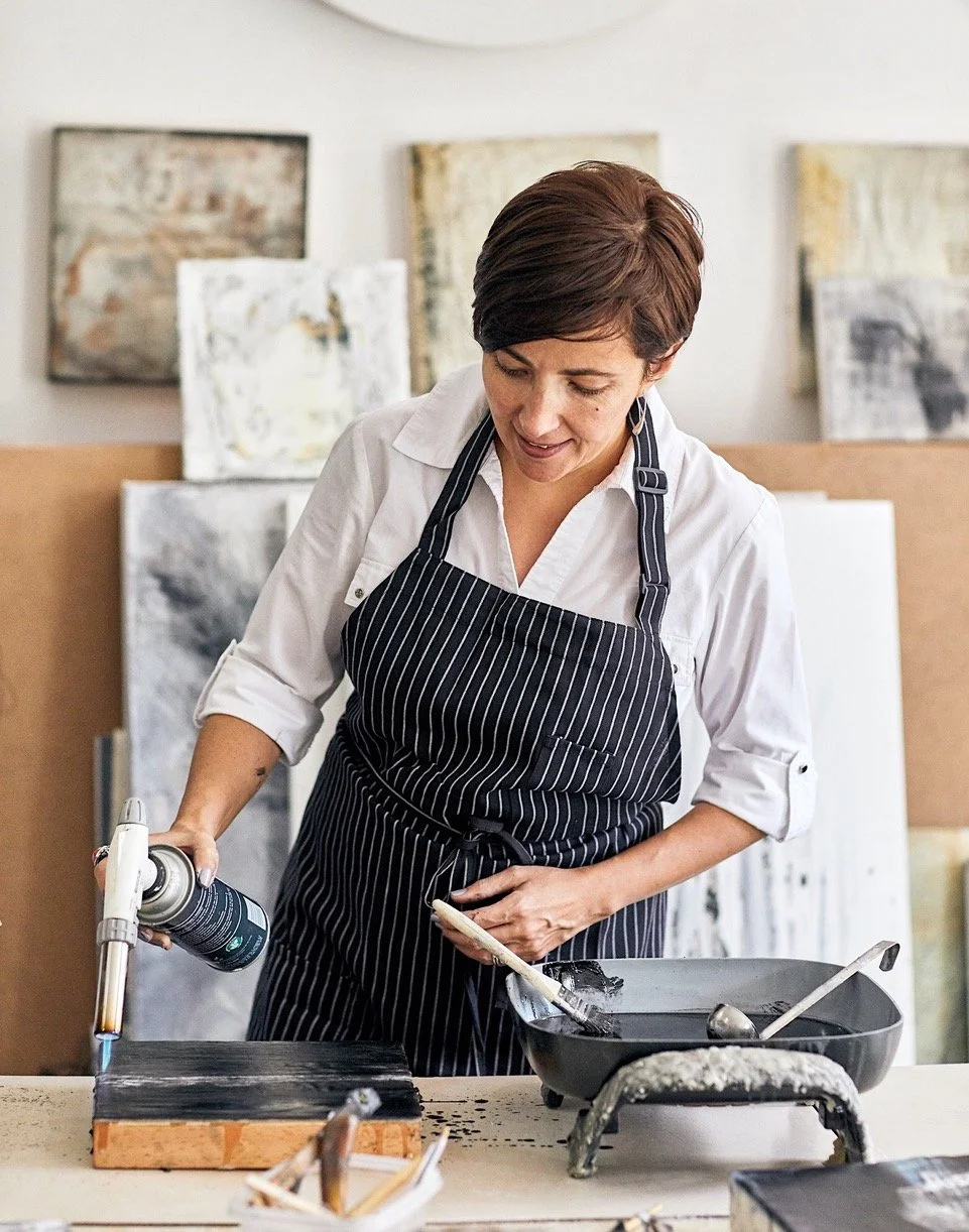 Gabriela Sánchez Apodaca is a visual artist from Mexico City, born in 1972, specializing in encaustic and mixed media techniques. With a background in Textile Design and a master’s in Visual Communication, her work is deeply rooted in the exploration of texture, layering, and personal narratives, often weaving in family letters, documents, and memories into her pieces. Since 2002, Gabriela has built a solid career with solo and collective exhibitions, recognized for her technical mastery and emotional expression. Her teaching practice extends beyond the studio, offering workshops on encaustic painting and mixed media techniques in both Mexico and internationally, inspiring others through her creative process.